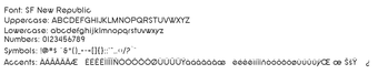 SF New Republic เป็นฟอนต์ซานส์เซอริฟสมัยใหม่ที่ออกแบบมาเพื่อความหลากหลายและความอ่านง่าย รุ่นเต็มนี้มีสไตล์ที่หลากหลาย ตั้งแต่ Regular ไปจนถึง Bold และ Italic ทำให้เหมาะสำหรับการใช้งานออกแบบที่แตกต่างกัน รูปแบบตัวอักษรที่กลมและขอบที่นุ่มนวลสร้างความสวยงามที่เชิญชวน โดยบาลานซ์ความชัดเจนในสมัยใหม่กับเสน่ห์แบบวินเทจที่ละเอียดอ่อน ตัวเลือกที่มีพลศาสตร์ของฟอนต์ตอบสนองต่อความต้องการการออกแบบที่แตกต่างกัน ทำให้มั่นใจได้ว่าสามารถใช้งานได้อย่างมีประสิทธิภาพในทั้งบริบทที่เป็นทางการและไม่เป็นทางการ